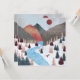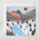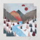 Ett vackert landskap med ett unikt struktur som visar ett flod- och bergslandskap med en räv i en hoppjakt i snö i röda, grönt, blått och beige.