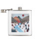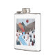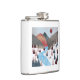 Ett vackert landskap med ett unikt struktur som visar ett flod- och bergslandskap med en räv i en hoppjakt i snö i röda, grönt, blått och beige.