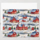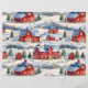 En vacker vinter mönster med en vinterplats i land med röda snö täckta hönshus.