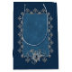 Vintage inspirerade elegant och ornat hammerad silver, skulpterade gräns med glitter blommigt snurrar, snöflinga och blåjuvel på ljus och mörk mitt i nattblåsnowflake och stjärnbakgrund i mönster.