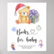 "Det är en Beary Sweet baby på väg." Fira med den här nallen, den där babyduschen party! Vaterfärgssöt nalle med julklapp, i tomhatt. På baksidan av kortet finns helgdag christmas mönster (candy cane, julgran boll leksak, julsockar). Matchande objekt är tillgängliga.