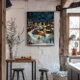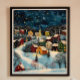 Vinternattens folkkonst-Oljemålning Poster Denna folkkonst-oljemålning fångar den förtjusande skönheten i en snöby under en mörk blått, stjärnande himmel. Scenen lever med vibrerande färg och kontrasterar nattens djupa blåsor med de färgfulla husen som filtas i snö. De dubbla stjärnorna ovanför ger en magisk beröring som belyser freden, det tysta landskapet nedanför. Den här målningen ger värme och charm till alla platser och frammanar en vinternatts fredlighet och i en kittlig, picturesk by. Perfekt för att lägga till en mysigt, nostalgisk känsla i din hemdekanter.
