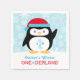 Winter wonderland "ONEderland" med den första födelsedagsfestens napkin-design har en söt arktisk penguin med en julhatt och anpassningsbar. Bakgrunden är mönster i snöflingor. Isblått, turkos, rött och vitt färg med svarta och grått accenter.