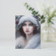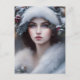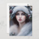 Helgdag vykort har en vacker prinsessa i vit päls-putsad hatt och vintern löv i vintagen stil porträtt. Ett vackert jultema porträtt skapat med AI-genererande software