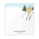 Personalizable notepad designed with ski instructors and skiing coaches in mind. The design features Destei's original watercolor woman skiing down a hill with green fir trees behind her and a blue snowy sky. On the bottom there are two personalizable text areas ideal for a name and job title whether ski instructor, skiing coach or ski guide, for example.