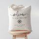 Välkomna gäster till ditt vinterbröllop med chicen och modern personlig tote bags. Utformningen är "välkommen till bröllop" i en modern blandning av handskrivna kalligrafskript och blockbokstäver, med utrymme att anpassa sig till namn och datum. En svartsnöflingsilhuettillustration kompletterar konstruktionen. Perfekt för bröllopsfavörer eller hotellvälkomstpåsar för julsäsong eller vinterbröllop!