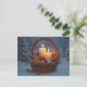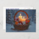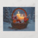 A yule postcard with a basket in the snow filled with everything Yule. Candles, orange slices, cinnamon sticks, herbs and spices.