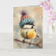 This cheerful songbird wears a textured teal knit hat, accented by warm golden tones on its chest. Soft neutrals and painterly textures surround the bird, creating a balanced and inviting winter composition. A lovely card for seasonal greetings, thank-yous, or sending a smile.