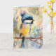 This expressive songbird illustration features a small bird perched on winter branches, bundled in a textured blue knit hat. Vibrant gold and soft blue tones blend with painterly brushstrokes to create a cozy yet lively winter scene. A charming greeting card for bird lovers, winter greetings, and artful correspondence.