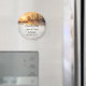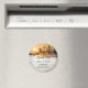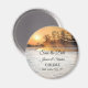 Ett romantiskt Spara datum magneter med vinter under jord vid solnedgång med festiv sträng ljus och mousserande snö.