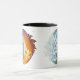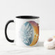 Depiction of a stylized globe in which two seasons meet—winter and autumn. On the left side, a delicate, frosty plant spreads out, symbolizing cold and tranquility. On the right side, autumnal leaves glow in warm shades of red and gold, embodying transition, passing, and change. The gentle division between the two halves is reminiscent of yin and yang, the balance between cold and warmth, endings and new beginnings.