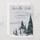 En underbar vinterscen av en snö fylld skog av mörk grönt gran och träd och en blek grått himlar dekorerar denna helgdag Spara datumet. Denna moderna teckning i ett snölandskap är perfekt för en bröllopsinbjudan i december eller januari.