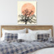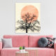 En silhuett av träd med obart grenar på vintern med rödaktig sol på ljusbeige bakgrund.