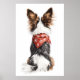Den här charmerande illustrationen visar baksidan av en papillon-hund som är försedd med en festlig röd bandana med vit snöflingor. Hund lyxiga päls, som är en blandning av brunt, svart och vitt, skapar en slående kontrast mot den vita bakgrunden. Den stora detaljrikedomen i päls struktur och den lekande beröringen av helgdag tillbehör framkallar en varm och glatt vinteranda. Perfekt för hundälskare och helgdag entusiaster!