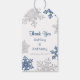 Vinterbröllop med marint blått och silver grått (grått) tack för att du föredrar taggar. Den här personligen är en märkre för bröllopsutformning ett underbart val för ett vinterbröllop med ett silver och ett marint blåsnöflingtema. Alla formuleringar om dessa djärva och moderna vintersnöflingor personlig bröllop-tack-ni-taggar kan ändras. Obs! Detta är en platt tryckt design utan några 3D- eller höjda präglingar. Silver färg simuleras av bläck och är inte av metall.