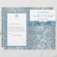 Den här eleganten och det kommande bröllopsprogrammet på 8,5 x11 tum med en silver grått och vit bakgrund med vit snöflingor och ett isblått fuktmönster för blommigt har ett tryckt stålblått band och båge med ett par diamantjuveler och FAUX blå glitter gått med hjärtan på det som överensstämmer med de vinter- eller bröllopsinbjudningar som visas nedan. Det är designat att vikas i mitten. Hela texten är anpassade. ****NOTERA ATT den högre klass-pappra är ett kort lagrar och inte förfaller väl. E-posta niteowlstudio@gmail.com om du behöver hjälp med att anpassa det här alternativet eller om du har frågor eller förfrågningar.