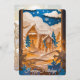 This enchanting Christmas card features a layered paper-cut style winter scene, with snowy hills, tall evergreens, and a cozy cabin nestled beneath drifting clouds and falling snowflakes. The rich blend of golden tones, icy whites, and deep blue sky creates a magical holiday atmosphere that feels both elegant and heartwarming. Perfect for sending season’s greetings, it captures the quiet beauty and wonder of Christmas in a snowy woodland.