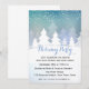 En inbjudan till julfest med vinterscenen av evergreen träd på snöbakgrund i mjuka blåa nyanser.