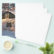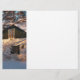 Tidigt morgonsoluppgången skiner på en färsk skrumpa av snö som täcker fält och lada.