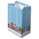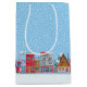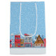 Vår Winter Wonderland Snowfall & Cabins Light Blue Gift Bag-design har en vattenfärgad illustration av hytter i snö i röda, blå, ljusblå, vita och bruna som omges av vintergröna gräs träd vita konetti snöflingor som lätt faller runt.