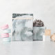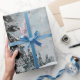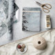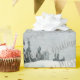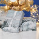 En vattenfärgad vinterskog i skymningen med en hånfull vit varg i förgrunden och ord, God jul, skriven i en vacker silver-kalligrafi över hela pappra.