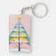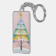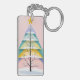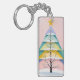 A vibrant, stylized composition depicting a Christmas tree in an abstract, layered landscape. The artwork features a distinct, dark central tree trunk and bare, snow-dusted branches reaching out across horizontal, triangular planes of color. These layers, rendered in soft pastel hues of pink, pale lavender, teal, and gold, suggest snow-covered tiers or an ethereal mountain range. A bright, golden, five-pointed star crowns the apex. The surface has a rich, textural quality, as if painted with thick paste or gouache. Gold accents highlight small, glowing spheres scattered across the branches and within the colorful layers, suggesting festive ornaments or winter light. The overall mood is cheerful, modern, and serene.
