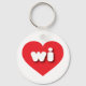 Den här nyckelkedjan har ett pulserande rött hjärta som innehåller det feta, vita, rundade nedre fodral brev wi, en lekfull förkortning för Wisconsin, badkartillståndet.