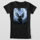 T-shirt med Wise One Fairy Cat från vildlivet och fantasi-konstnären Michaeline McDonald från en svart katt med glödande blå och svart vingar mot en svart stjärna himlar.