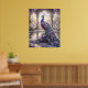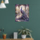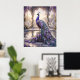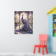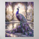 A magnificent wisteria peacock displays its grand tail in an opulent palace garden where regal beauty meets cascading blooms. Realistic peacock anatomy blends with wisteria flowers, trailing vines, jeweled eyespots, and luminous feather textures in violet, jade, sapphire, and gold tones. Marble terraces, reflecting pools, soft mist, fountains, and warm dawn light create a luxurious cinematic setting. This statement fantasy bird design adds glamour to living rooms, bedrooms, offices, or gift collections. Perfect for peacock lovers, floral decor fans, and elegant interiors.