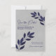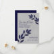 Dessa elegant bröllop sparar datumkorten med en rustik men modern utformning med spriter av marinblått löv som kommer in från båda sidor av kortet på en grått-bakgrund. Typografin är unik och elegant med både lämnat text och marginaljusterad höger. De här korten är enkla och snyggt, det är perfekten för att informera dina vänner och din familj om ditt kommande bröllop.
