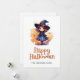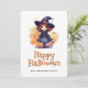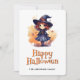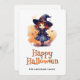 Happy halloween-kort med en vattenfärgad illustration av en liten häxa i en hatt. Anpassa enkelt den här söta Halloween-kortets för barn med din familj namn och text.