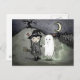 En söt Halloween-bild. En liten häxa och spöke håller händer mot en mörk av en glödande måne, skrämmande träd och pookemeteri. Små röda kärlek-hjärtan ovanför deras huvuden.