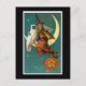 En söt vintage Halloween-illustration med en häxa och hennes stora medan hon äger sitta på ett kuster måne med jack o lantern hängande nedanför