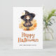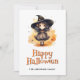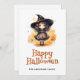 Happy halloween-kort med en vattenfärgad illustration av en liten häxa i hatt, pumpor och spöken. Anpassa enkelt den här söta Halloween-kortets för barn med din familj namn och text.
