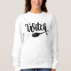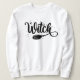 Den svarta och vita designen har ord "Witch" i ett fet, flytande skriptteckensnitt, där svan-änden av brev "h" omvandlas till en broompits handtag. Texten är stiliserad med ett lekfullt, handskrivet utseende, vilket ger en visuell beröring till det övergripande temat. Omkring ord är spridda stjärnor som skapar en magisk, stjärnnattseffekt som förstärker det häxaktiga temat. Bromskortet, som placeras diagonalt under texten, lägger till ett dynamiskt inslag i designen, vilket tyder på rörelse och djup.