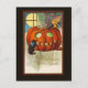 vintage Halloween-konst med älvor, en svart katt och en pumpa.