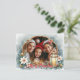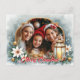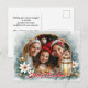 A festive postcard featuring a customizable photo framed by white poinsettias, pinecones, holly, and golden ornaments. A glowing lantern adds warmth beside a decorated tree. “Merry Christmas” script tops the scene. All text—front and back—is fully customizable to share your holiday joy.