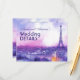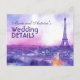 Presenting another exquisite creation from the Amour Éternel à la Parisienne collection: a poetic fusion of timeless romance and modern elegance in a wedding details enclosure card. On the front, the names of the happy couple, Emily and Michael, are gracefully displayed in a blend of flowing script and classic serif fonts. The backdrop features a dreamy watercolor illustration of Paris at twilight—soft washes of lavender, blush, and moonlit blue envelop the iconic Eiffel Tower, which rises above a glowing cityscape of charming rooftops and cobblestone streets.