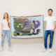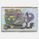 En trollkarl på lila som har en lila kristaller boll. En liten grönt drake, keltisk knut fungerar, ljus och gräns i höst löv i en ljusblå bakgrund