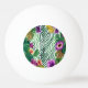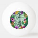 Das Bild zeigt ein lebendiges Mosaik aus üppigen Monstera-Blättern in sattem Grün und Gelb, kombiniert mit prächtigen purpur- und orangefarbenen Blumen, die sich vor einem dynamischen, wellenartigen Hintergrund abheben. Es strahlt eine wilde, tropische Energie und eine fröhliche Fülle aus, die Neugier und Naturverbundenheit weckt.