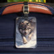 A majestic grey wolf with piercing yellow eyes stands on a thick tree trunk, its powerful paws gripping the bark. The wolf's fur is thick and textured, with a hint of brown around its muzzle. The background features a winter forest. Perfect gift for wolf lovers.