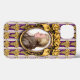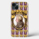 Denna design är en porträtt av den klassiska musikkompositören Wolfgang Amadeus Mozart. porträtt är en profiluppsättning i ett ornate oval golden ram. ram hänger på en lila tapet med gyllene druvor i rader och lodrät vitt och lavender rand.
