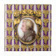 ZoeSPEAK:s ursprungliga illustration av detta lilla keramiska plattor har en porträtt av den klassiska musikkompositören Wolfgang Amadeus Mozart. Porträtt är en profiluppsättning i ett ornat ovalt golden ram. Ram hänger på en lila tapet-bakgrund med gyllene vinklingar i rader och lodrät vitt och lavender rand.