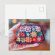 A woman holding a handmade crocheted coin purse crafted from colorful granny squares featuring a detailed floral motif. The image highlights traditional yarn craftsmanship, fine stitching, and the charm of creative handmade accessories.