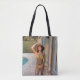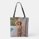 Woman in yellow bikini standing on brown brick flo tygkasse