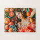 Woman reclining among fruits and petals pussel