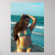 A swimsuit model in a patterned bikini poses by the ocean, basking in the sun. The waves gently lap at the shore under a clear blue sky.