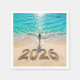 A young woman walks towards a sparkling turquoise ocean where the year "2026" is written in the sand