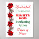 The names of Jesus, given in the Bible are listed here in alternating green and red colors. Along the side, is a garland of red poinsettias for a festive Christmas accent. Each name is spelled out in a font that expresses the attribute of God, such as a flowing “wonderful”. Have a blessed holiday!