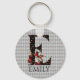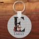 Den vita "Wonderland"-nyckelkedjan har vintage Alice och färg-drottningen av hearts-tecknen med stor brev/inledande E med svarta/guld/röda kort-svit fyller mönster på en grått-harlequin-bakgrund i vintagen. Anpassa ytterligare med anpassade namn